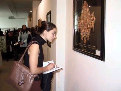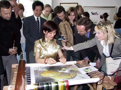 一名乌克兰姑娘在认真欣赏刺绣精品