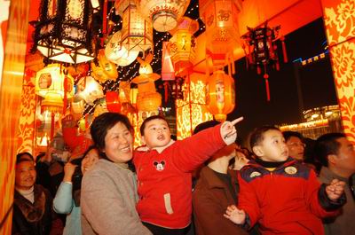 在杭州武林广场,一名小朋友骑在大人的肩上看花灯。 |