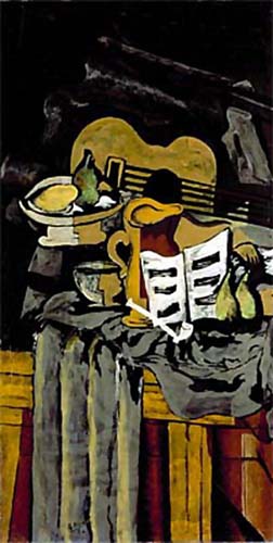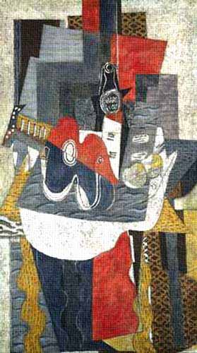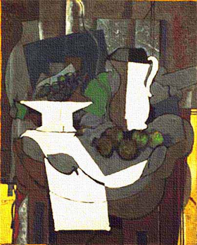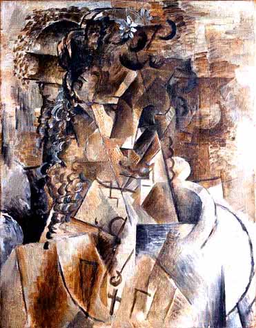 如果说毕加索表现出对体积的特别关切,勃拉克则比任何人都更会创造造型空间,给人以深远之感.总地说来,他这时期的绘画由于统一完整,结构严密,色彩的高雅趣味和朴实精美----黑色、灰色、淡灰褐色、绿色、稠腻的白色----而别具一格.他的颜色尽管不鲜艳,却发出神秘的回响.在他的哪怕是最严格的创作中,都有一种微妙的银白色光亮,给人留下深刻印象.在这些通常被看作是最不鲜艳,最暗淡的颜色下面,似乎有团在小心、缓慢地燃烧着的永恒之火.他对于精确、和谐、变化、价值的凝炼表达不失高雅趣味,厌恶粗糙、激烈对比、默守成规、囿于陈法和莽撞的抒情.他对分析、推断和外形分解的喜爱胜过综合、直观和对外形的缩减与图解化.这就是为什么勃拉克驾驭了立体派第一阶段的原因.毫无疑问,立体派要大大感谢勃拉克的这种分析特点.他首先将这一研究应用于人物形象,然后又应用于静物.他想象出一种新的空间,找到了以更为完全,几乎是以立体式的视觉为基础的新形状.角和线的组合,多种平面的迭瓦状排列,物体各部分的展现和它们对画面的同时投射,乃是一种为纯造型价值而抛弃陈法俗套的主要手段. |